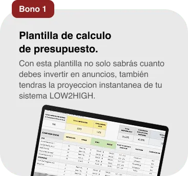 • La estrategia exacta de inversión en anuncios para vender los productos low ticket de forma apalancada y con riesgo controlado (La parte high no necesita inversión en anuncios).